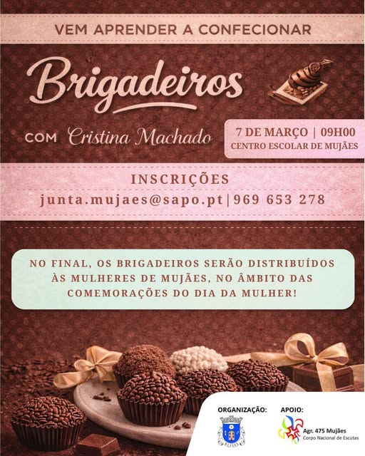 No próximo dia 7 de março, pelas 9h00, realiza-se no Centro Escolar de Mujães um workshop de confeção de brigadeiros, orientado por Cristina Machado.